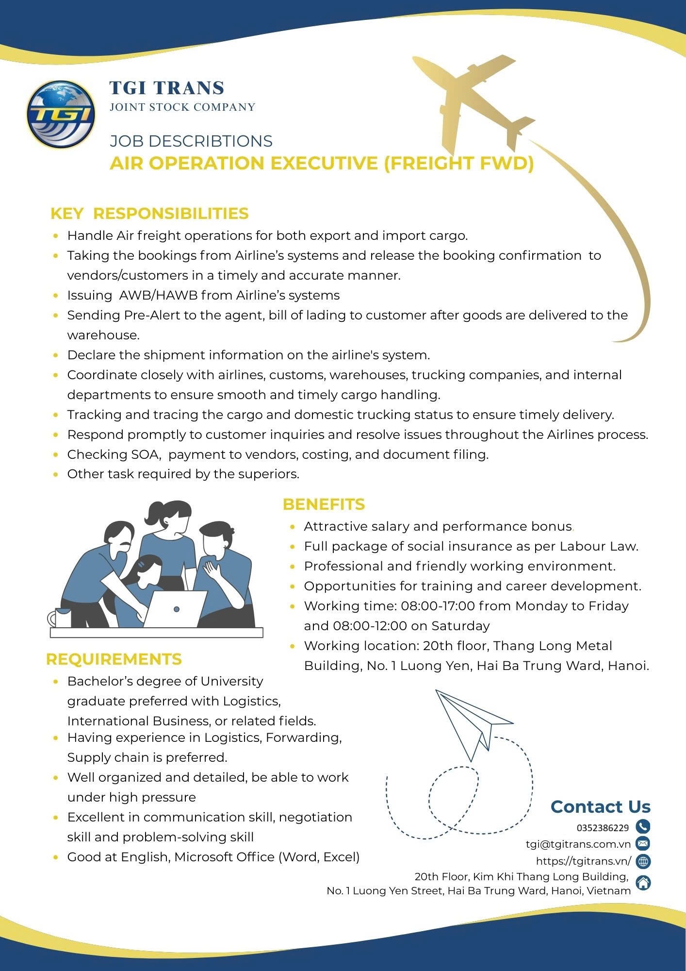 TGI TRANS JOINT STOCK COMPANY đang tìm kiếm những ứng viên năng động, tỉ mỉ gia nhập đội ngũ Logistics tại trụ sở Hà Nội. Nếu bạn đam mê lĩnh vực Forwarding, đặc biệt là vận tải hàng không (Air Freight), đây là cơ hội tuyệt vời để phát triển sự nghiệp trong một môi trường chuyên nghiệp và thân thiện.